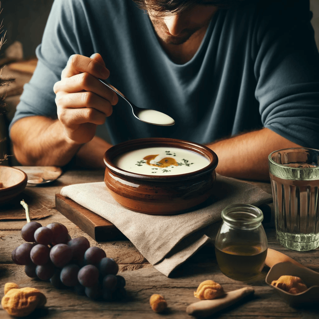 Cómo Disfrutar y Saborear el Ajo Blanco Apreciación Visual    – Observa la presentación del ajo blanco. El plato debe tener un aspecto suave y cremoso, con un color blanco puro y brillante.  Gusto