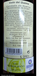 - Vino Vado del Quema blanco afrutado, D.O. Condado de Huelva, uva Zalema, botella 0.7 l.
