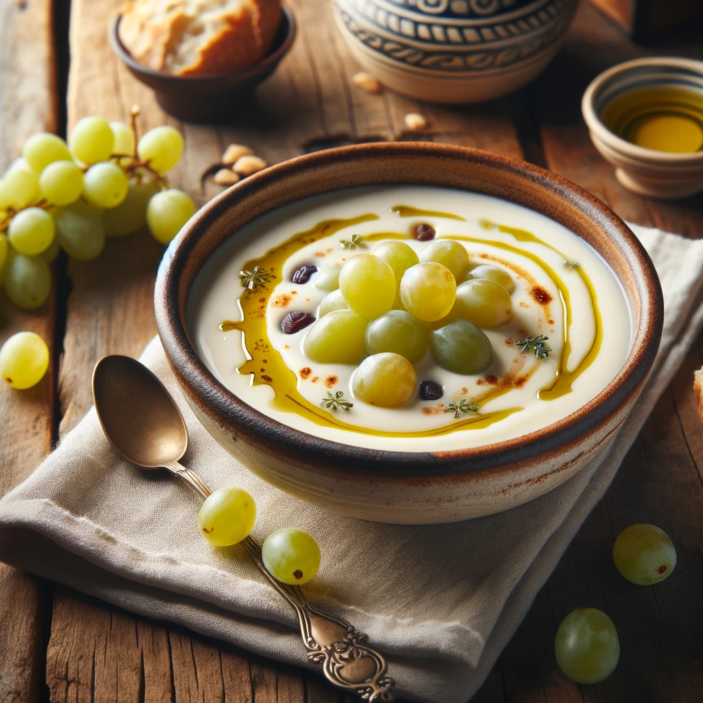 – Variedad de acompañamientos: Además de las uvas, puedes servir el ajo blanco con trozos de melón o manzana para un toque diferente.