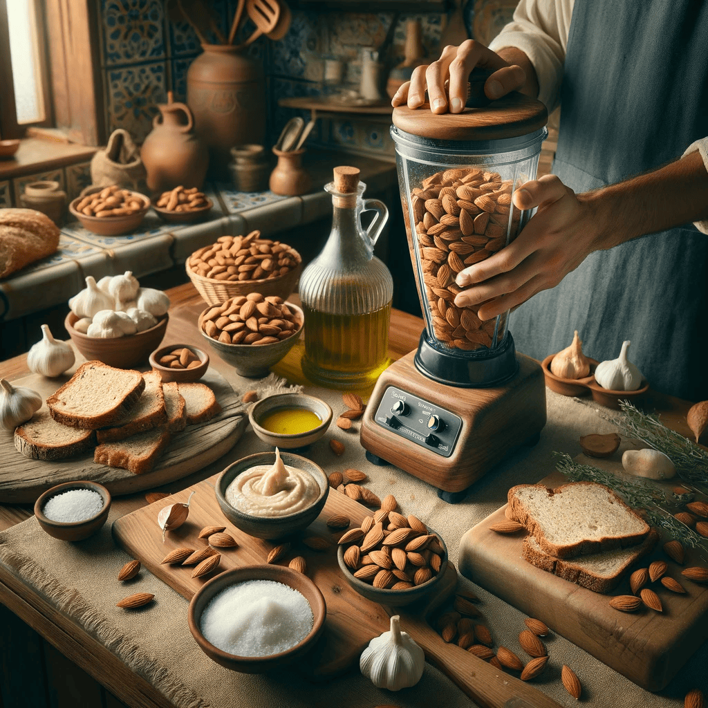 – En un procesador de alimentos o una batidora, añade las almendras peladas y los dientes de ajo. Tritura hasta obtener una pasta fina. 🌰🧄