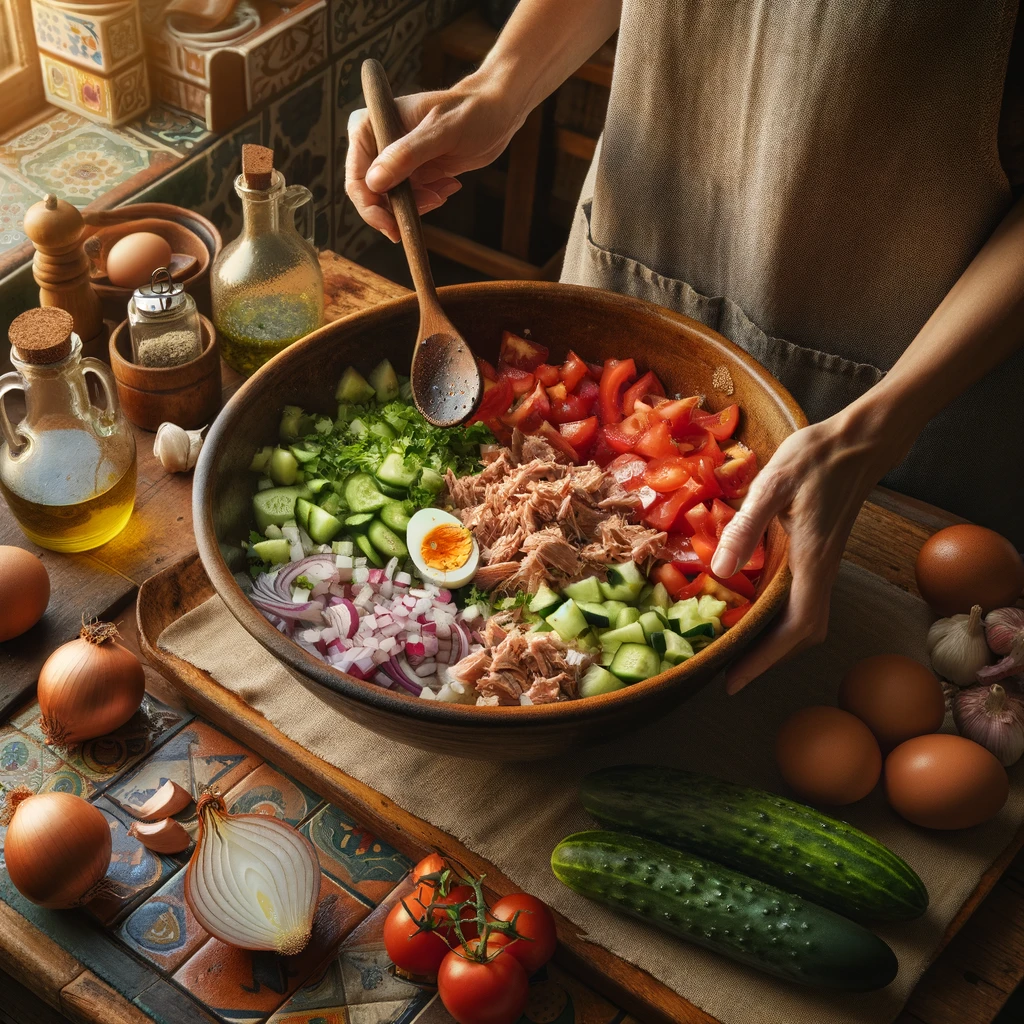 – En un bol grande, añade los tomates, el pimiento, el pepino, la cebolla, el ajo, los huevos duros y el atún.