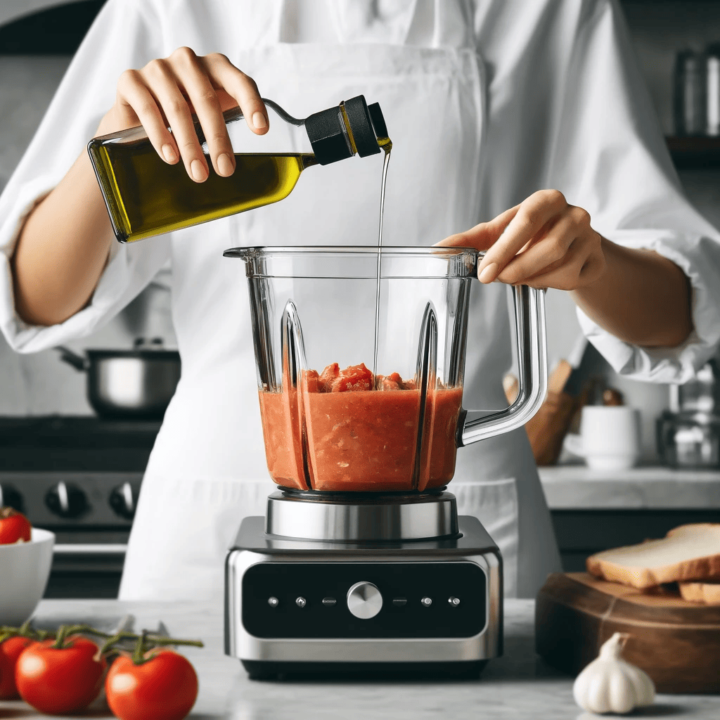 – Mientras sigues triturando, añade poco a poco el aceite de oliva en forma de hilo. Esto ayudará a emulsionar el salmorejo y le dará una textura más cremosa.