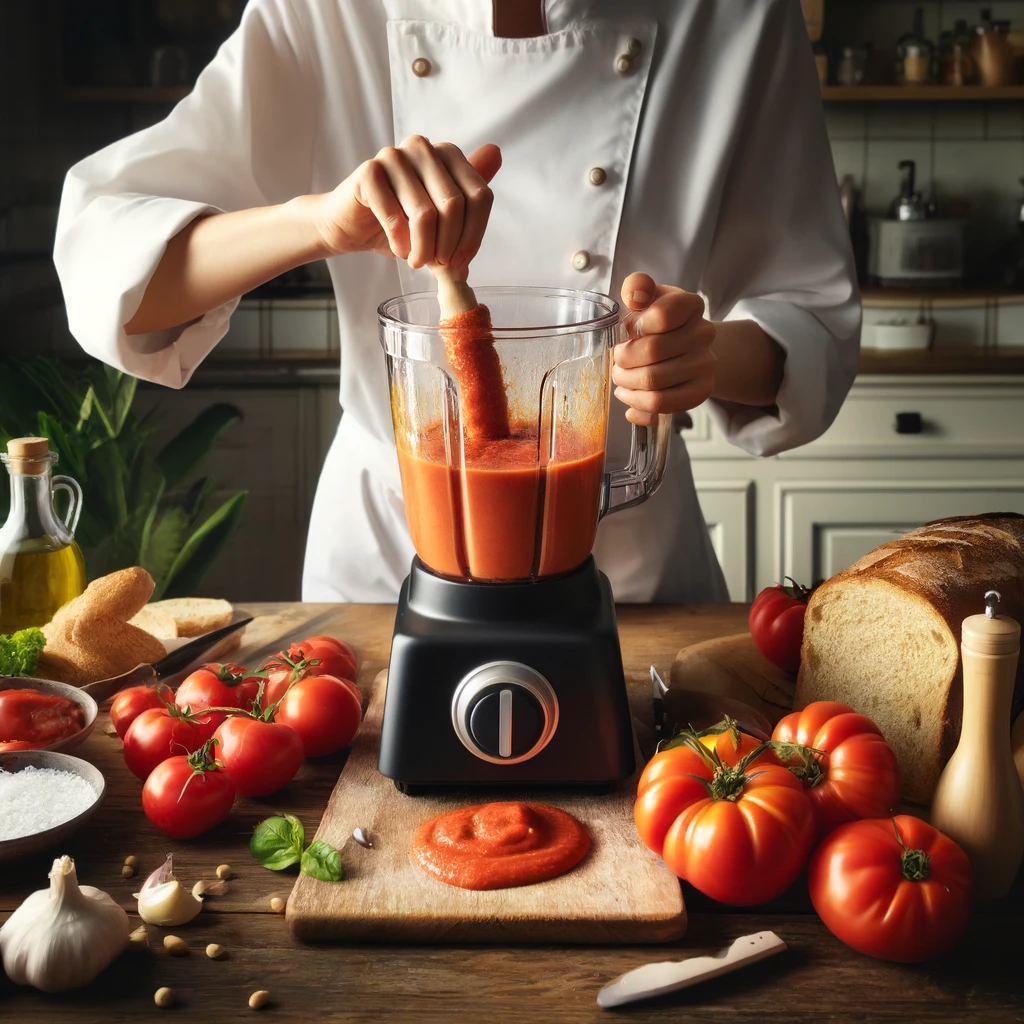 – En un procesador de alimentos o una batidora, añade los tomates, el pan escurrido, el ajo, y una pizca de sal.